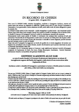 14 Agosto 2004 - 14 Agosto 2014 Dieci anni fa moriva nel nostro mare per salvare un bagnante in difficoltà il cittadino senegalese Cheick Sarr,…