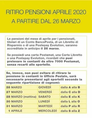 Dal 26 marzo, per la consegna delle pensioni, sarà aperto tutti i giorni, secondo la calendarizzazione evidenziata nell'immagine