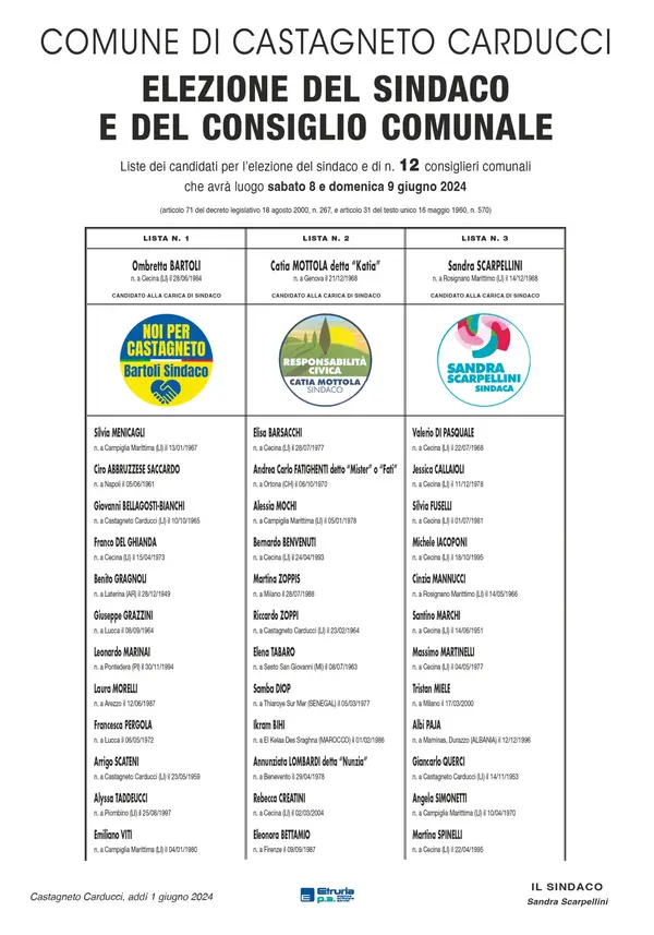Nel file i candidati a Sindaco e la lista dei candidati consiglieri per le Elezioni Amministrative 2024 nel nostro comune e i relativi programmi elettorali